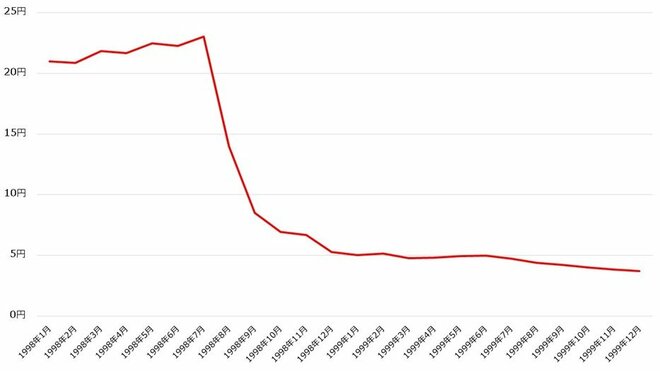【ロシア財政危機におけるルーブル円の推移】