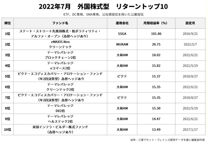 7月のリターン1位は「ステート・ストリート先進国株式・低ボラティリティ・アルファ・オープン(為替ヘッジあり)」(101.86%)