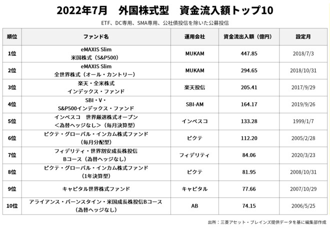 7月の資金流入額1位は「eMAXIS Slim 米国株式(S&P500)」(447.85億円)