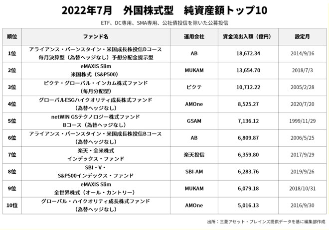 7月の純資産残高1位は「アライアンス・バーンスタイン・米国成長株投信Dコース毎月決算型(為替ヘッジなし)予想分配金提示型」(1兆8,672億円)