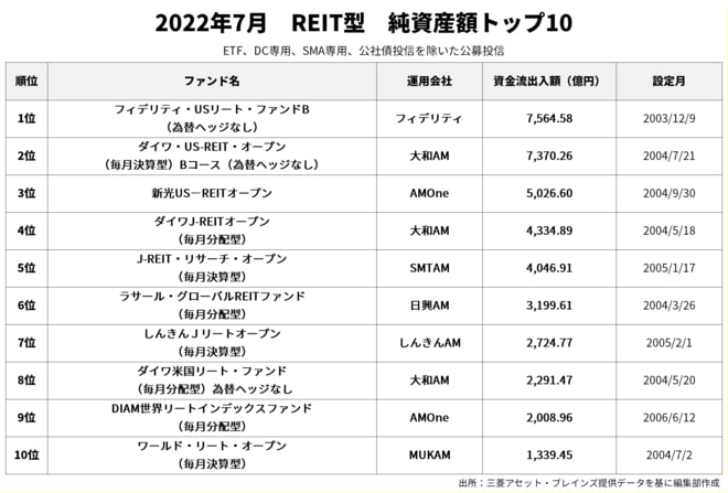 7月の純資産残高1位は「フィデリティ・USリート・ファンドB(為替ヘッジなし)」(7,564.58億円)