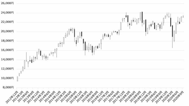 【第2~4次安倍内閣における日経平均株価(月足、2012年12月~2020年9月)】