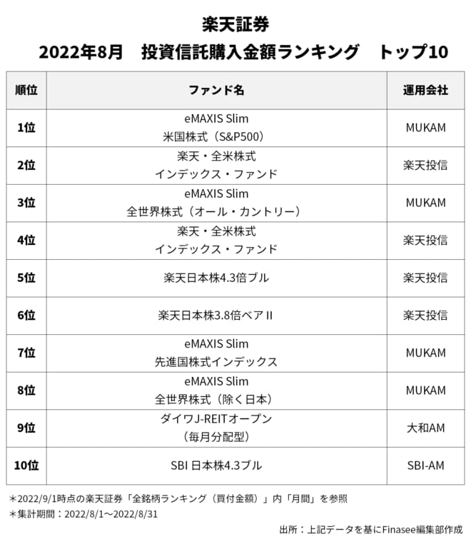 2022年8月、楽天証券で多くの資金を集めたのは以下のファンドだった。