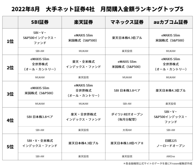 ネット証券では、8月も「eMAXIS Slim 米国株式(S&P500)」の人気が高かった。各ネット証券のランキングは、以下の通り。
