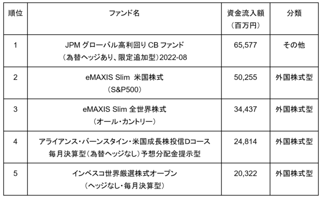 「JPMグローバル高利回りCBファンド(為替ヘッジあり、限定追加型)2022-08」が資金流入額1位に