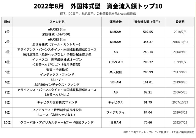 8月の資金流入額1位は「eMAXIS Slim 米国株式(S&P500)」(502.55億円)