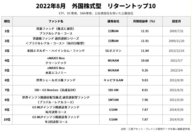 外国株式型ファンドの8月ランキング1位は、「資源ファンド(株式と通貨)ブラジルレアル」コースだった。同ファンドは世界の資源株に投資するアクティブファンドで、「ブラジルレアル・コース」「南アフリカランド・コース」「オーストラリアドル・コース」の3つのコースがある。8月は資源株が上昇したことに加え、円安・ブラジルレアル高が進んだので、11.91%と高いリターンになった。