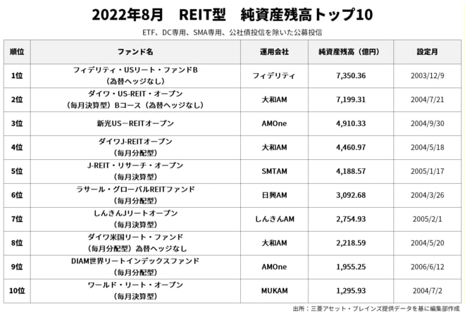 8月の純資産残高1位は「フィデリティ・USリート・ファンドB(為替ヘッジなし)」(7,350.36億円)