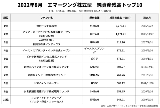 8月の純資産残高1位は「野村インド株投資」(2770.61億円)