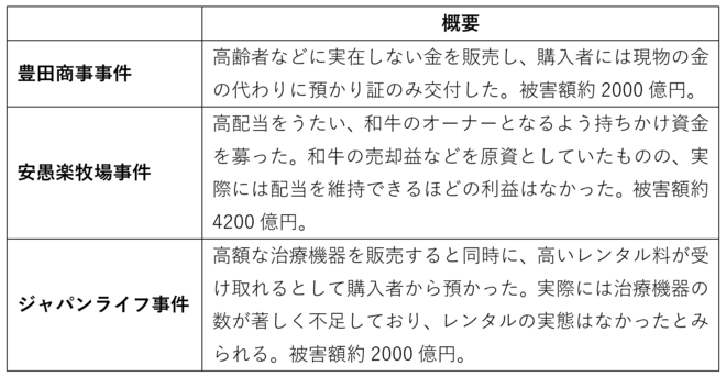 ケフィアグループの手口は一般に「販売預託商法」と呼ばれます。これは元本保証や高利回りをうたい、購入と同時に商品を預けさせる取引の総称です。購入者が商品を確認しないまま取引が進められる点に特徴があり、これまで悪質な事件が多発してきました。
