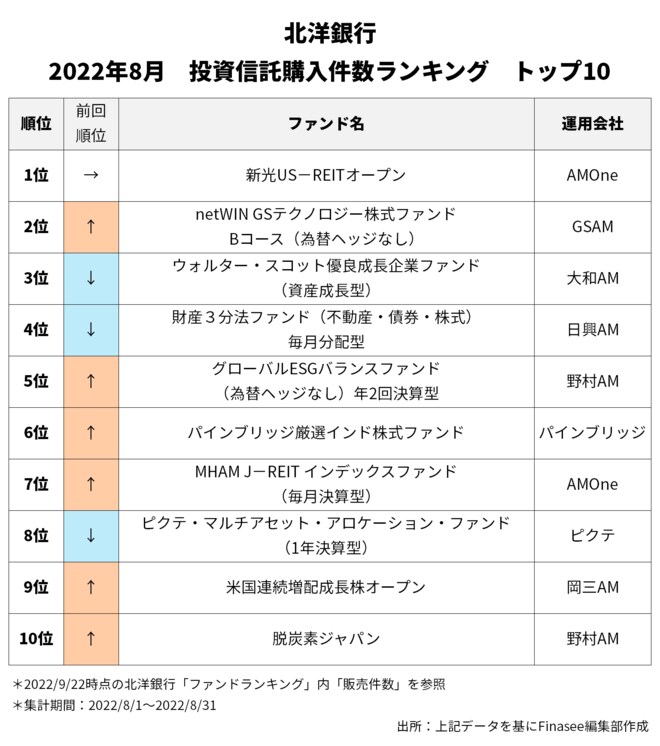 2022年8月、北洋銀行で多くの資金を集めたのは以下のファンドだった。