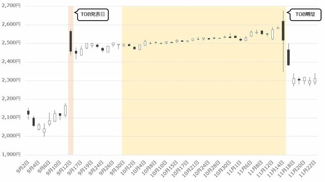 なお、TOBが実施されたとしても、株主は必ずしも応じる必要はありません。そのまま保有し続けてもよいですし、TOBに応じず市場で売却することも可能です。TOB期間のZOZO株式においても、市場で売買された形跡が見られました。当初はTOB価格2620円を下回る価格で取引されていましたが、最終日に向かって株価は上昇しています。