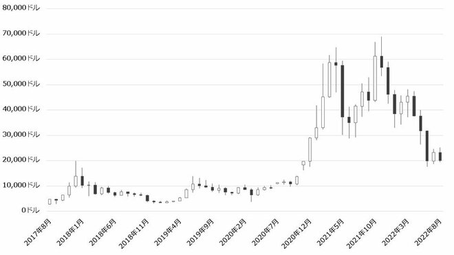 【ビットコイン(BTC/USD)の価格推移(月足、2017年8月~2022年8月)】