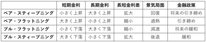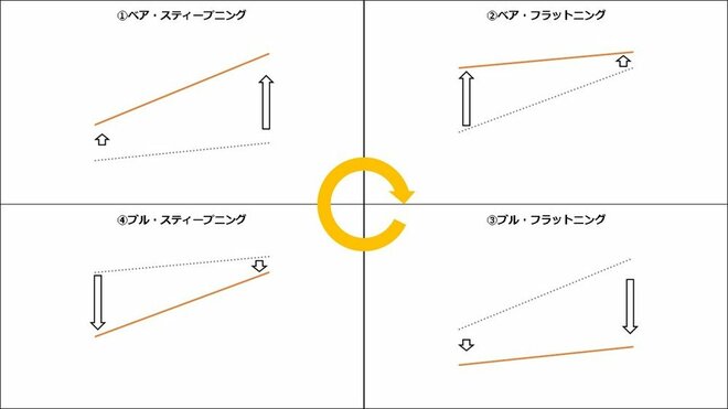 イールドカーブにおいて、長短金利差が縮小し傾斜が弱まることを「フラットニング」といい、反対に傾斜が強まることを「スティープニング」といいます。また、金融引き締めを想定した弱気相場を「ベア相場」、反対に金融緩和を想定した強気相場を「ブル相場」と呼び、それぞれを組み合わせた「ベア・スティープニング」「ベア・フラットニング」「ブル・フラットニング」「ブル・スティープニング」という4つの形状変化を繰り返す傾向があります。