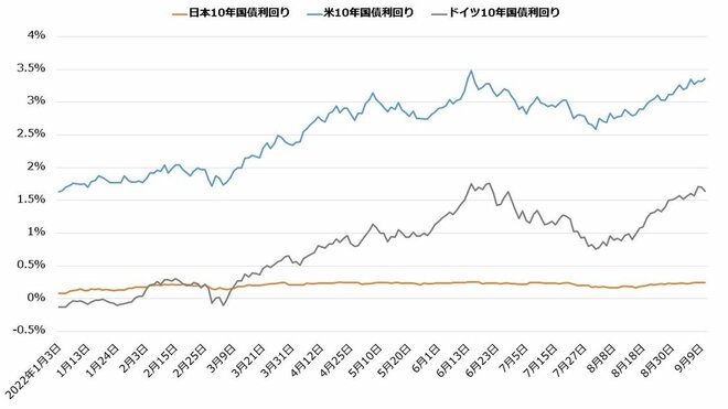 【日本・アメリカ・ドイツの10年国債利回りの推移(2022年1月3日~9月12日)】