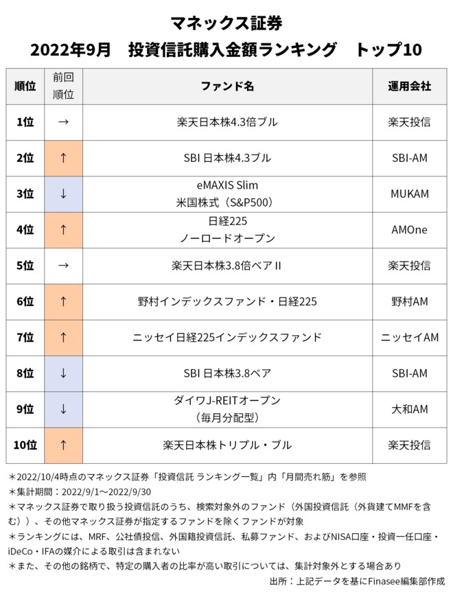 マネックス証券の9月ランキングでは、日経平均株価を対象にしたインデックスファンドが3つランクインしている。ランキング4位の「日経225ノーロードオープン」は、日経平均株価(日経225)に連動する投資成果を目指して運用を行うインデックスファンド。純資産残高は2,000億円を超えており、国内の株価指数を対象にしたインデックスファンドの中では最大規模を誇る。日経平均株価を対象にしたインデックスファンドは株式市場が下落する局面で買いが増える傾向にあり、10月以降も株価下落局面では同ファンドに買いが入る可能性は高いだろう。