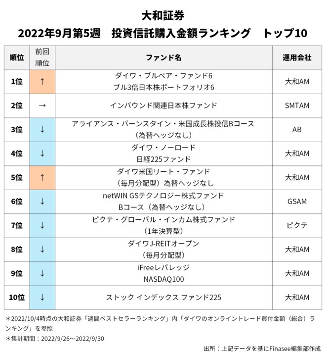 2022年9月第5週、大和証券で多くの資金を集めたのは以下のファンドだった。