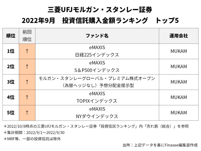 2022年9月、三菱UFJモルガン・スタンレー証券で多くの資金を集めたのは以下のファンドだった。