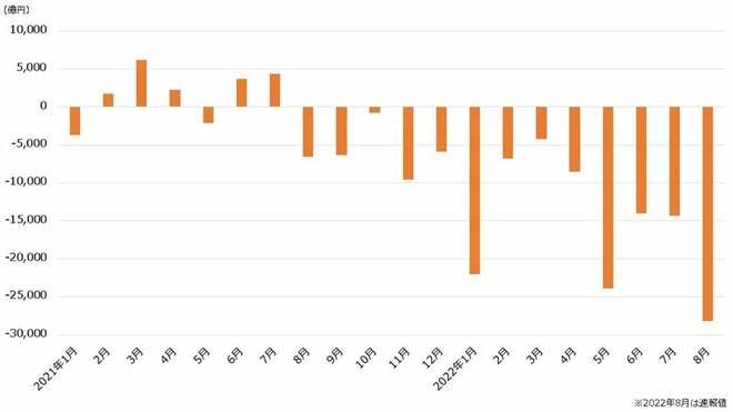 原油価格の高騰は、エネルギー資源を輸入に頼る日本にとって貿易収支を悪化させる要因です。今年は原油価格が大きく上昇したことから、8月の貿易収支は2兆8173.24億円の赤字となりました(速報値)。内訳は輸出8兆619.25億円に対し輸入が10兆8792.49億円で、単月の赤字幅としては過去最大です。また、同時に進行した円安も輸入額を押し上げ、赤字幅を拡大させる要因となりました。
