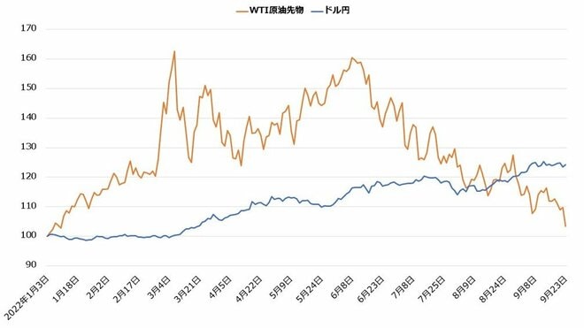 【原油価格とドル円の推移(2022年1月3日を100とした場合)】