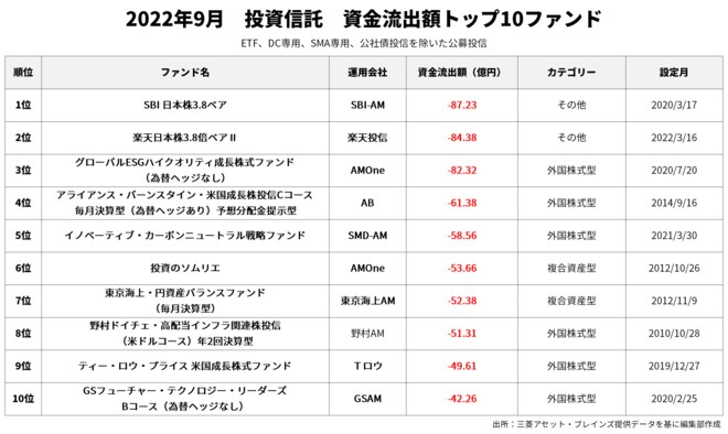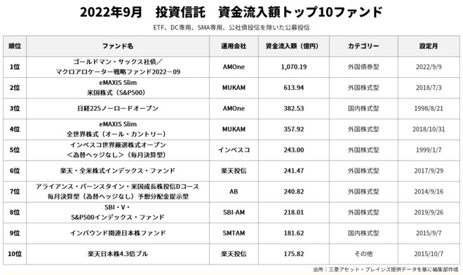 9月の資金流入額1位は「ゴールドマン・サックス社債/マクロアロケーター戦略ファンド2022-09」(1,070.19億円)