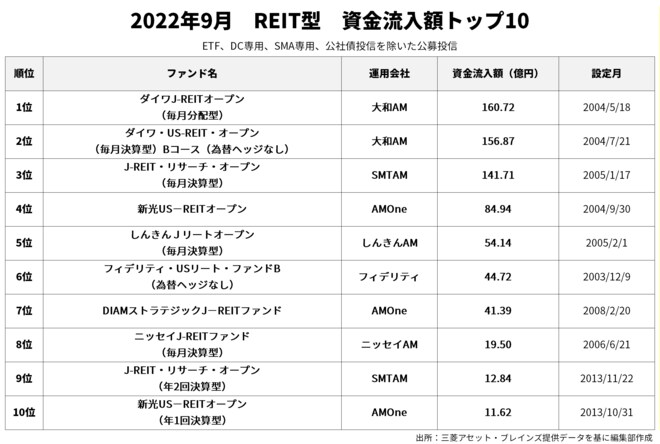 9月の資金流入額1位は「ダイワJ-REITオープン(毎月分配型)」(160.72億円)