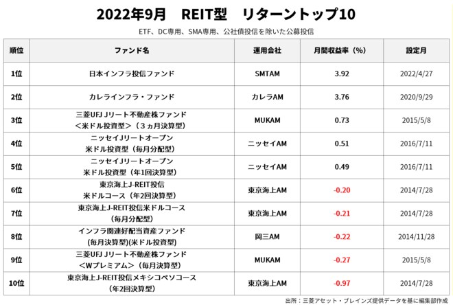 9月のリターン1位は「日本インフラ投信ファンド」(3.92%)