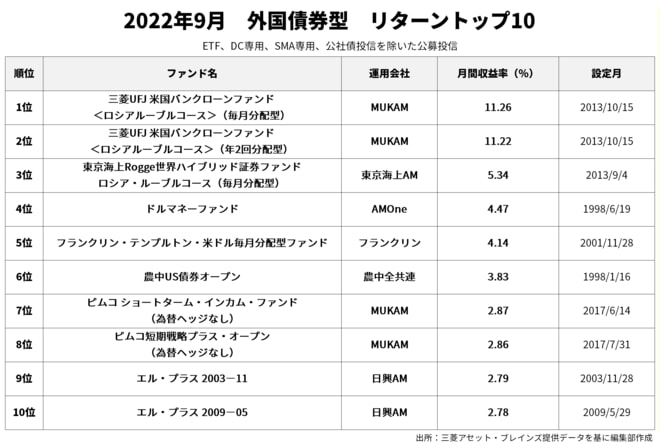 9月のリターン1位は「三菱UFJ米国・バンクローンファンド<ロシアルーブルコース>(毎月分配型)」(11.26%)