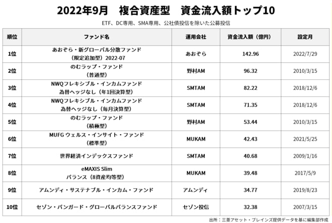 9月の資金流入額1位は「あおぞら・新グローバル分散ファンド(限定追加型)2022-07」(142.96億円)