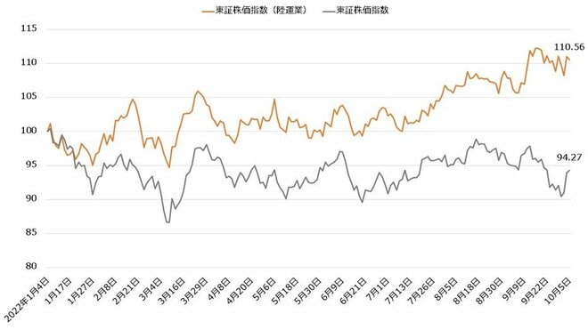 【2022年における東証株価指数(陸運業)の推移(年始を100とした場合)】