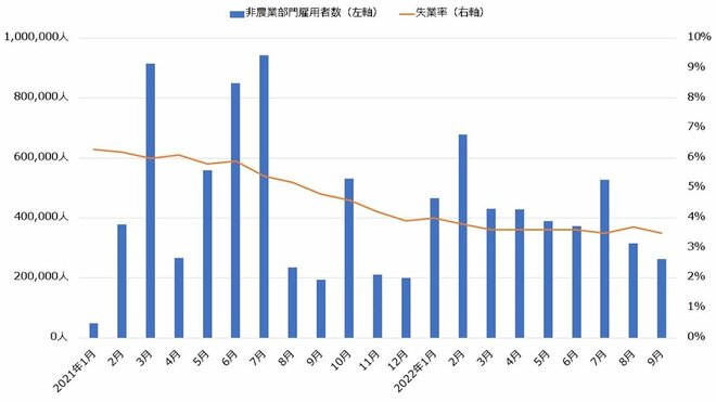 直近発表された2022年9月分では、非農業部門雇用者数が26万3000人の増加、失業率3.5%となりました。2021年以降は非農業部門雇用者数がマイナスになったことはなく、失業率も比較的落ち着いています。
