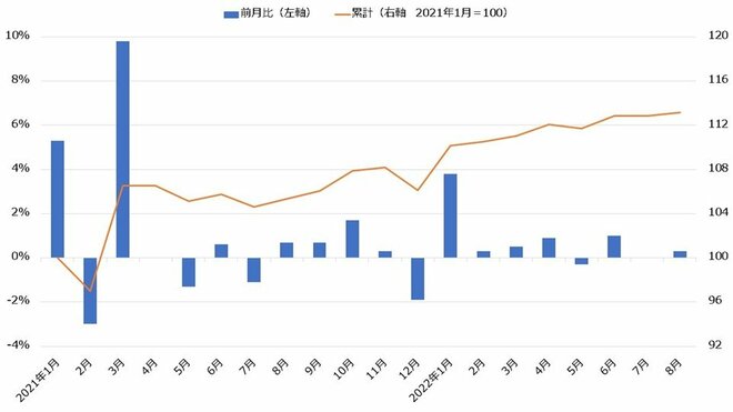 米国小売売上高は2021年2月に寒波などの影響でやや大きく落ち込みました。しかし翌月には前月比9.8%増と急回復します。その後は短期的に上下しながらも、おおむね右肩上がりで推移しました。