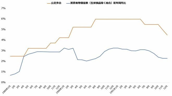 さらに当時の政策金利に相当する「公定歩合」の引き上げも、経済を冷やした原因だと考えられています。日本銀行は1989年から公定歩合を上昇させ、翌年にはピークとなる6%に到達しました。インフレを抑え込む効果はありましたが、急速な利上げに市場は冷え込み、バブル崩壊の影響を長引かせたと指摘されるようになります。