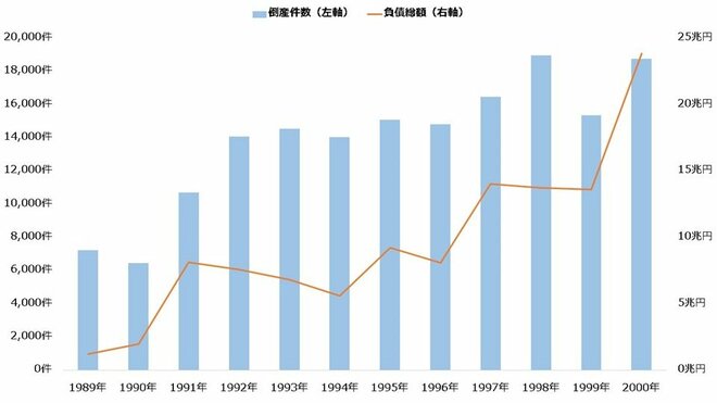 これらの施策の結果、バブル経済は終わり、1990年代の後半にかけ企業倒産が増加しました。金融機関においても不良債権の増加につながり、破綻が相次ぐことになります。
