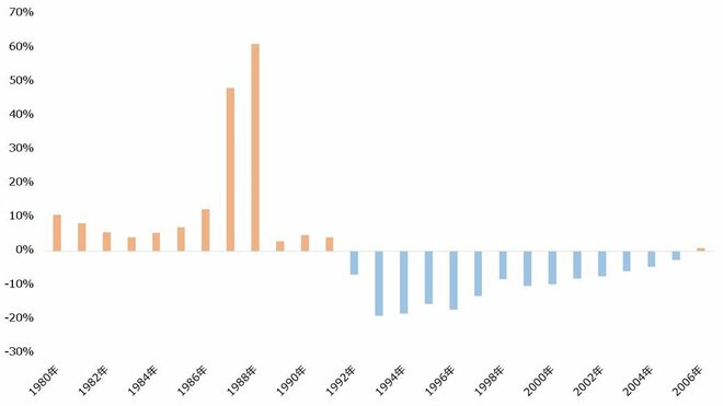 国土交通省が毎年公表する「地価公示価格」をさかのぼると、東京圏における商業地の上昇は1988年にピークを迎え、上昇率は61.1%にもなりました。しかし総量規制の翌々年(1992年)にマイナスに転じ、その後2005年まで14年間も下落が続きました。