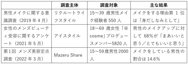 ここ数年、男性の化粧に関する調査が毎年のように報告されています。調査内容はさまざまですが、おおむね男性が化粧をすることに対して好意的な結果が得られているようです。