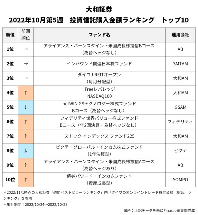 2022年10月第5週、大和証券で多くの資金を集めたのは以下のファンドだった。