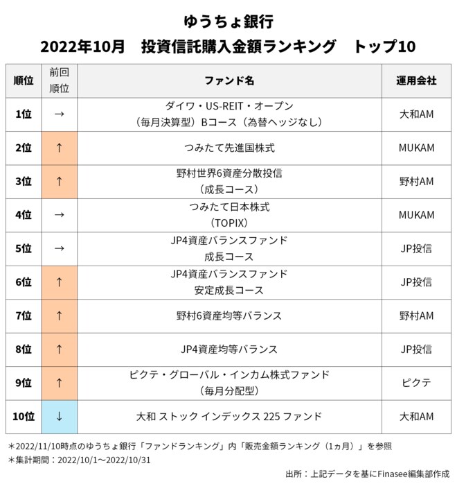 ゆうちょ銀行の10月ランキング1位は、「ダイワ・US-REIT・オープン(毎月決算型)Bコース(為替ヘッジなし)」だった。同ファンドは米国のリートに投資し、原則、為替ヘッジは行わない。10月は+7.4%のプラスリターンとなった。また、ポートフォリオの配当利回りは3.8%となっている。ただ、米10年債利回りが4%前後となり、米国リートの魅力は低下している。11月以降も同ファンドがゆうちょ銀行のランキング上位に入るかどうかに注目だ。