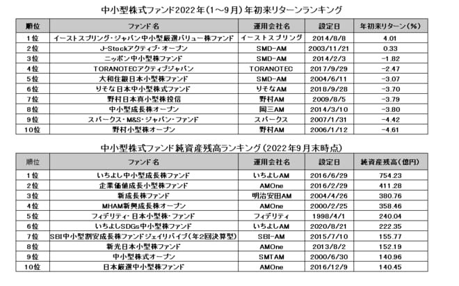 2022年9月末時点における日本株の中小型株式ファンドのリターンランキング上位と、純資産残高上位ファンドは、以下の通り。
