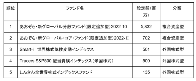 10月の新規設定は12本だった。約77億円の設定額となったが、9月の1,510億円から大きく減少し、2022年5月の約17億円以来、5カ月ぶりに100億円を下回った。10月の設定額上位ファンドは、以下の通り。