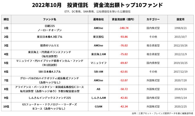 10月の資金流出額1位は「日経225ノーロードオープン」(140.74億円)