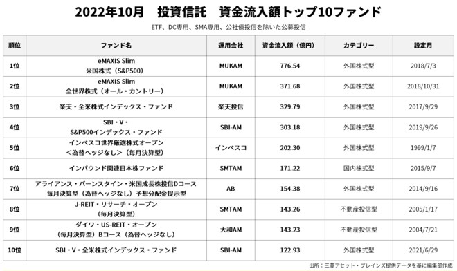 10月の資金流入額1位は「eMAXIS Slim 米国株式(S&P500)」(776.54億円)
