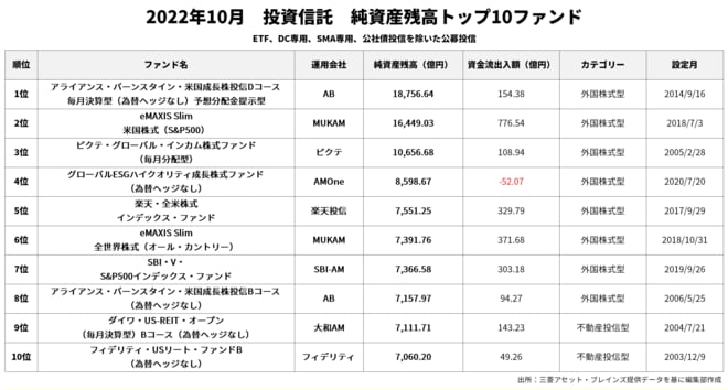 10月の純資産残高1位は「アライアンス・バーンスタイン・米国成長株投信Dコース毎月決算型(為替ヘッジなし)予想分配金提示型」(1兆8,756億円)