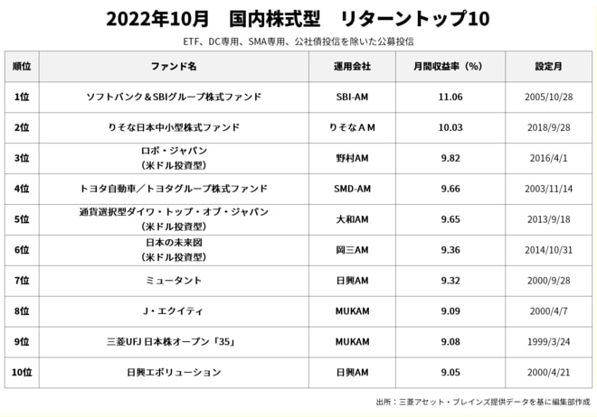 10月のリターン1位は「ソフトバンク&SBIグループ株式ファンド」(11.06%)