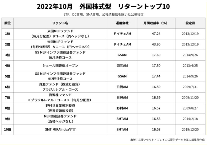 10月のリターン1位は「米国MLPファンド(毎月分配型)B(円ヘッジなし)」(47.24%)