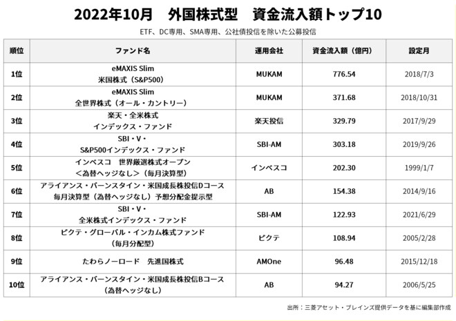10月の資金流入額1位は「eMAXIS Slim 米国株式(S&P500)」(776.54億円)