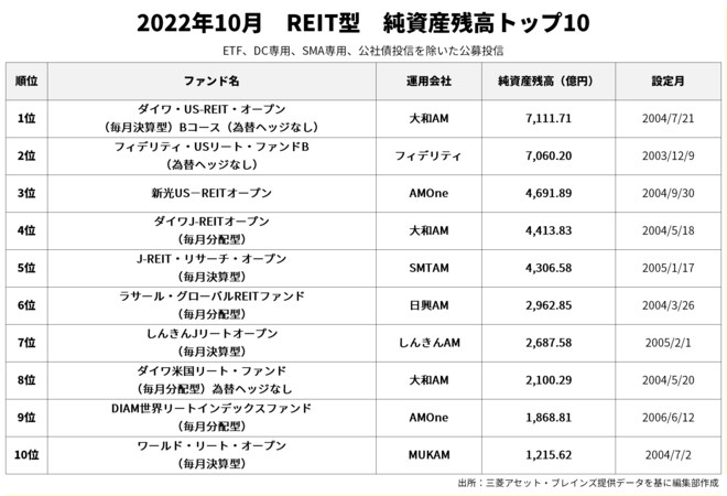 10月の純資産残高1位は「ダイワ・US-REIT・オープン(毎月決算型)Bコース(為替ヘッジなし)」(7,111.71億円)