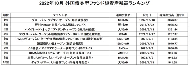 2022年10月末時点における純資産額上位10ファンドは、以下の通り。