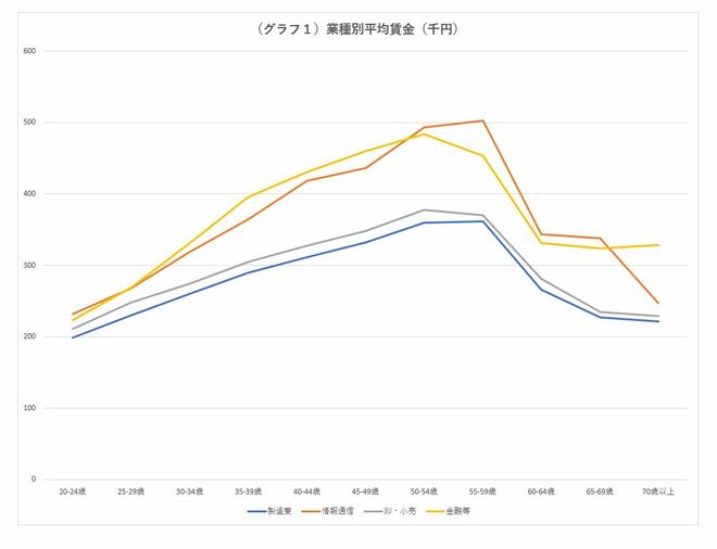 そしてこの間、金融業・保険業は、他の業種に比べて比較的高めの賃金を享受しています。本稿では16業種すべての比較ではなく、「製造業」、「情報通信」、「卸・小売」、「金融業・保険業」の4業種で比較してみましたが(グラフ1)、「金融業・保険業」の賃金は25-29歳で「情報通信」を上回り、45-49歳までその優位が維持されています。もちろん、「製造業」や「卸・小売」を大きく上回っているのは、言うまでもありません。確かに、金融業・保険業は他の業種に比べて、高所得者であると言えます。