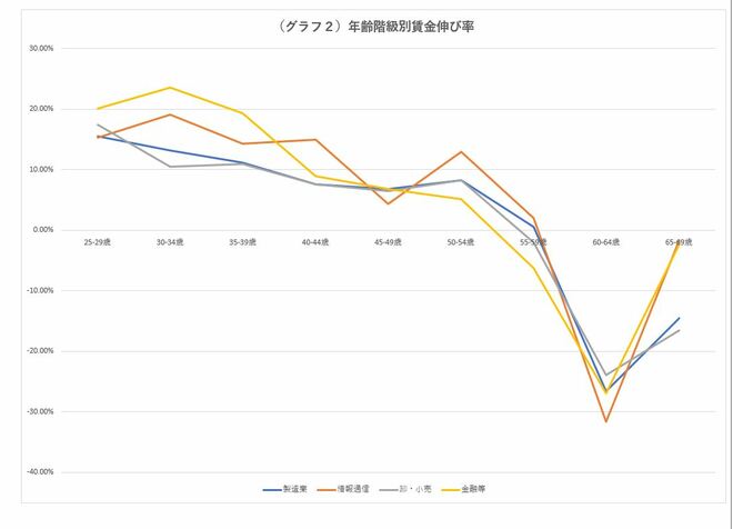 グラフ2は、年齢階級別の賃金の前期比推移を示したものです。どの業種も、若い時は大きく伸びて、年齢階級が上がるほど伸び率が落ちていくのが分かります。